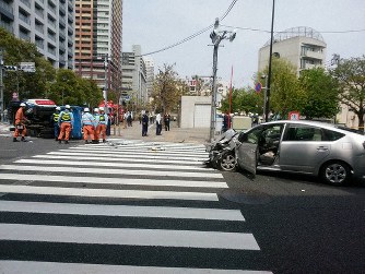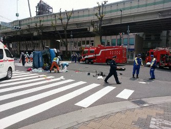 現場近くのドライアイス販売店の男性従業員(54)は衝突音を聞いて店外に飛び出したという。「若い女性が血だらけになり、歩道の近くに横たわっていた。動いていないようだった。ごみ収集車が横転していた。乗用車やトラックなど複数の車が衝突したようだった」と興奮した様子で語った。