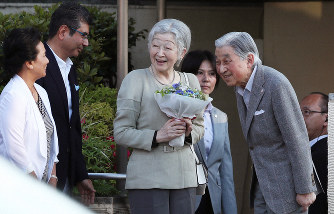 ご夫妻は午後4時20分ごろ、車の窓を開けて、集まった近くの住民らに手を振りながら到着した。
