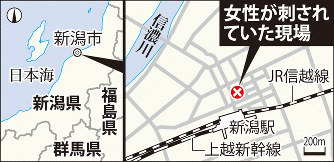 新潟県警に入った連絡によると、15日午後9時ごろ、新潟市中央区東大通1のJR新潟駅前のビルで「女性が男に刺され、意識のない状態で倒れている」と110番があった。新潟県警や新潟市消防などによると、20代女性が刃物のようなもので刺されたとみられ、病院に搬送されたが死亡が確認された。男は逃走しており、県警が殺人事件として捜査している。